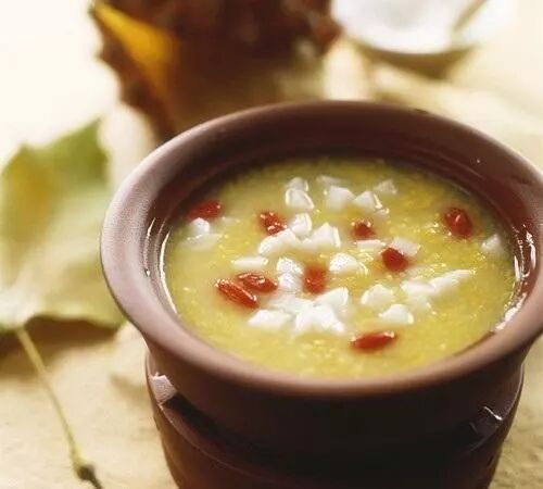 小米可以熬成粥,也可以做成小米饭。基本上和大米一样,也是先淘干净米,锅内加适量的水,等水烧开后倒入小米,再加一点点碱面,搅动几下,旺火烧开,使锅内上下翻滚,改用文火使稍微沸腾,同时要隔几分钟搅动一下,以免糊锅。等米粒完全裂开后停火,稍微再等等,小米粥就好了。舀一碗,一股淡淡的清香味弥漫整个灶房,金黄色的米粒错落有致,汤汁淡黄,浓稠合适。上面飘着一层薄薄的金黄色米汤油,等稍凉一会,这层金黄色的米汤油就冷凝成一层有韧性的薄膜,像一层塑料保鲜膜覆盖上面似的。当然啦,小米粥里可以加绿豆,黄豆,花皮豆等,这样就变成了“豆米汤”了。