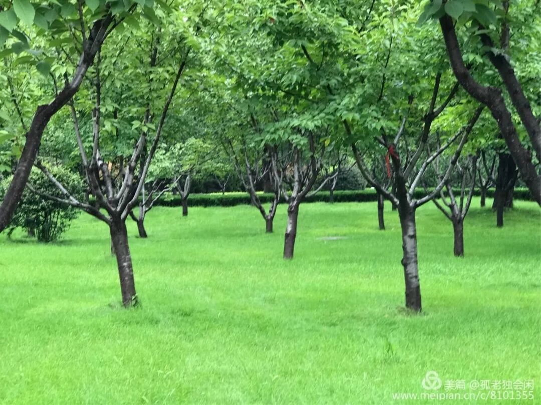 连片的樱花、红叶李树下,草坪像绿毯一样延伸去,满目翠绿,俨然是春的来临了,不由的使我感叹大自然的美,也体会到"随意春芳歇,王孙自可留。"的九月春光。