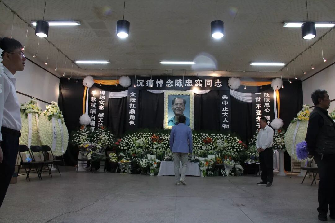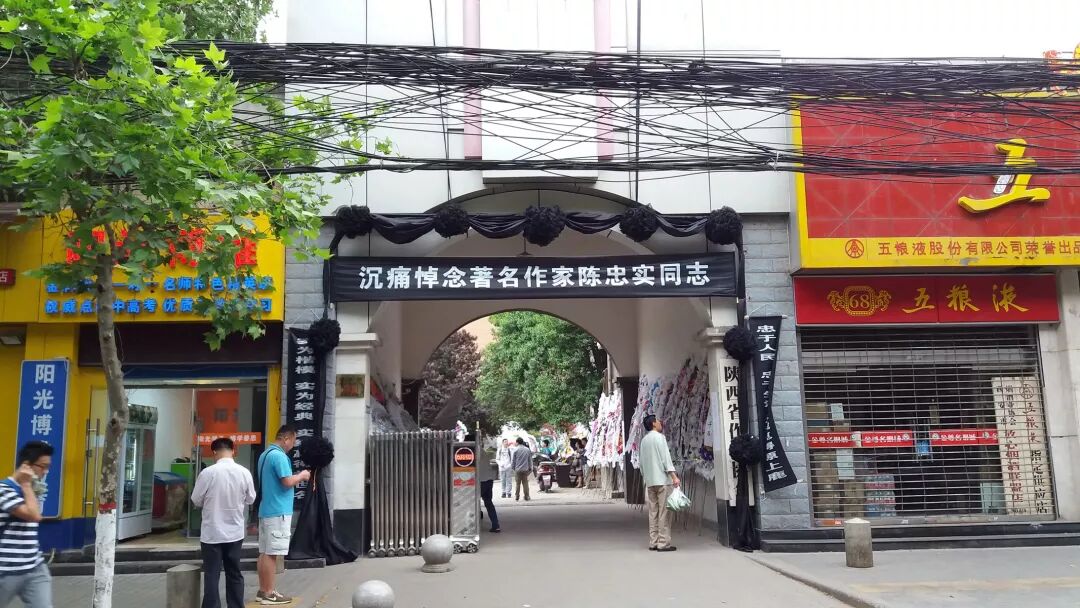 第二天,我带着侄子侄女,一大早就驱车赶到了陕西作协。天微雨,作协的大门上早已拉起了黑底白字的挽联,上联是:忠于人民忠于生活忠诚觅得原上鹿。下联是:实为楷模实为经典实绩赢得举世名。横联是:沉痛悼念著名作家陈忠实同志。还不到八点,只有几个工作人员在忙着挪桌子凳子,我也上去帮忙,还吩咐侄子侄女一起来搭手,把雨中的花圈移到过道和房檐底下。花圈太多,礼堂前花坛边屋檐下到处都是,成百上千,只能摞在一起,主要人物和单位,贾平凹,黄道峻,高建群,吴三大等人的花圈都摆放在显眼的位置。