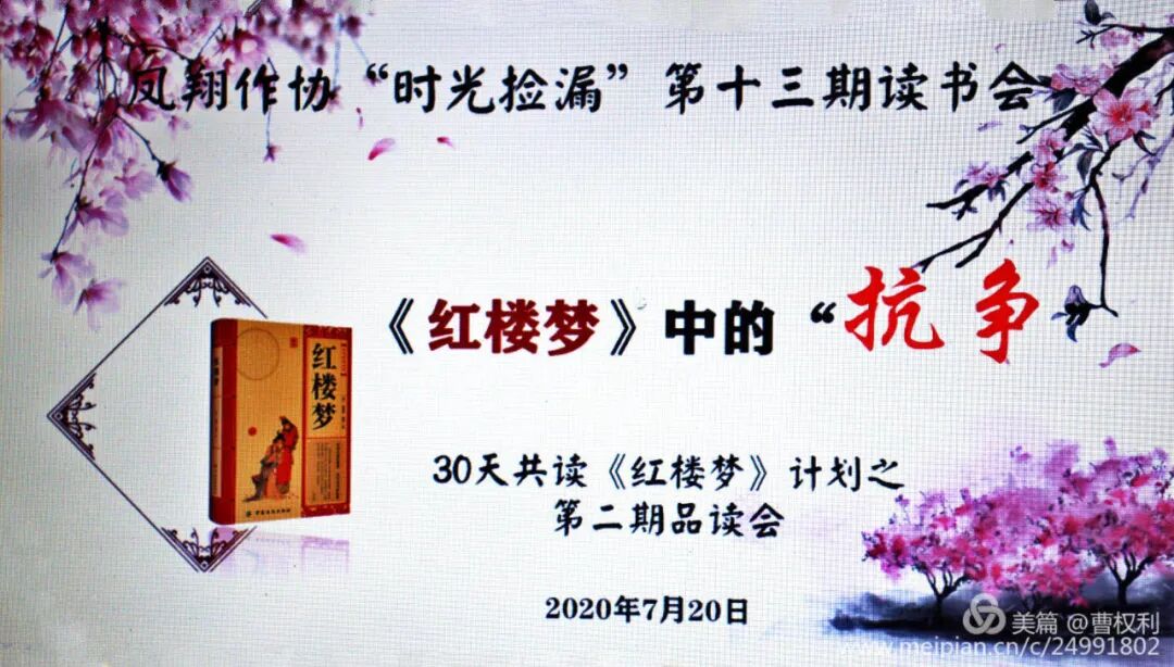 7月20日傍晚,难得的一个晴天,微风细细,阳光淡淡。凤翔作协《时光捡漏》第十三期读书会——“品味经典 梦回红楼”30天共读《红楼梦》第二期分享活动在东湖南门毗邻的东坡茶馆如期进行。