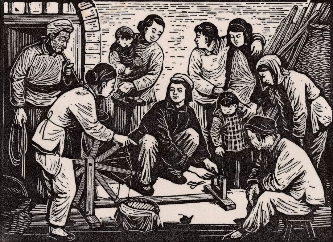 力群,《帮助群众修理纺车》,木刻版画,14×19厘米