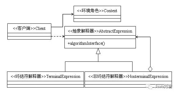 抽象解释器:声明一个所有具体表达式都要实现的抽象接口(或者抽象类),接口中主要是一个interpret()方法,称为解释操作。具体解释任务由它的各个实现类来完成,具体的解释器分别由终结符解释器TerminalExpression和非终结符解释器NonterminalExpression完成。