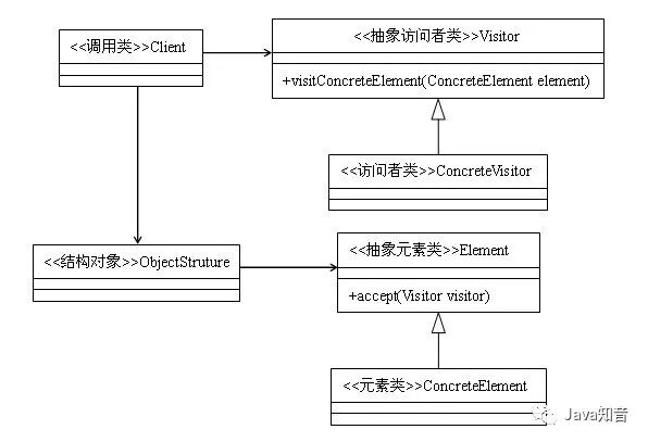 抽象元素类:接口或者抽象类,声明接受哪一类访问者访问,程序上是通过accept方法中的参数来定义的。抽象元素一般有两类方法,一部分是本身的业务逻辑,另外就是允许接收哪类访问者来访问。