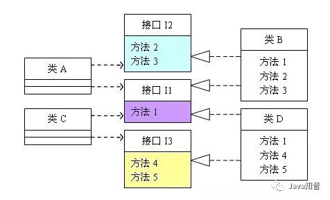 这个图的意思是:类A依赖接口I中的方法1、方法2、方法3,类B是对类A依赖的实现。类C依赖接口I中的方法1、方法4、方法5,类D是对类C依赖的实现。对于类B和类D来说,虽然他们都存在着用不到的方法(也就是图中红色字体标记的方法),但由于实现了接口I,所以也必须要实现这些用不到的方法。对类图不熟悉的可以参照程序代码来理解,代码如下:
