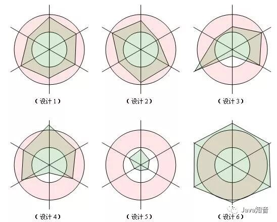 图中的每一条维度各代表一项原则,我们依据对这项原则的遵守程度在维度上画一个点,则如果对这项原则遵守的合理的话,这个点应该落在红色的同心圆内部;如果遵守的差,点将会在小圆内部;如果过度遵守,点将会落在大圆外部。一个良好的设计体现在图中,应该是六个顶点都在同心圆中的六边形。