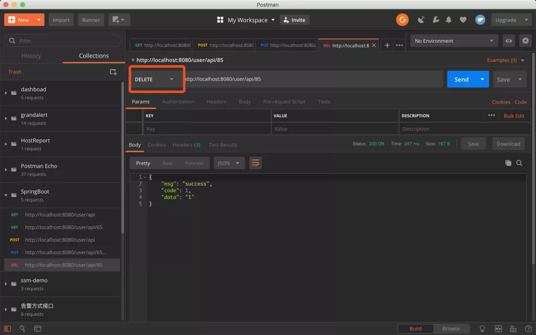 对于/user/api/1 HTTP DELETE请求来删除id为1的用户