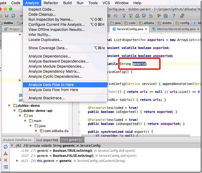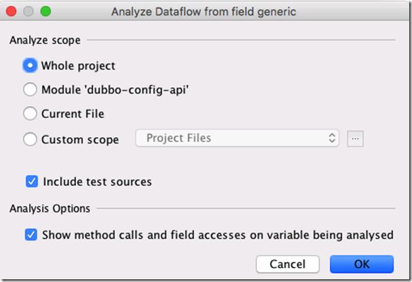 IntelliJ IDEA中可以在主菜单中选择Analyze | Dataflow from/to Here两个命令查看表达式、变量和方法参数的传递关系树。