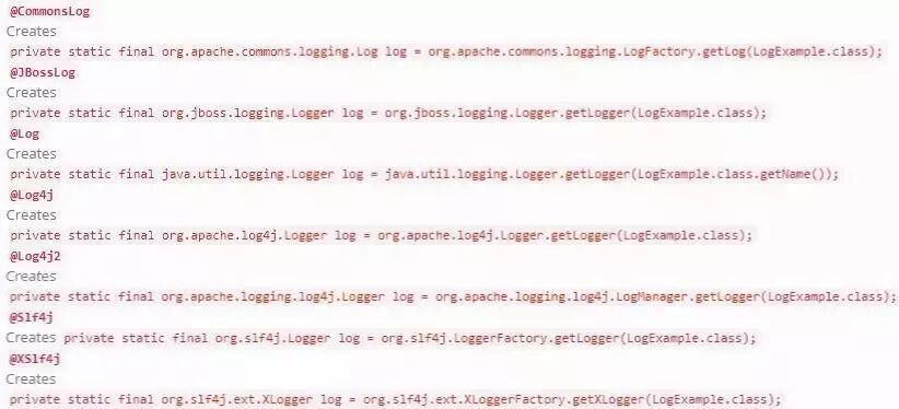 @Log:作用于类上,生成日志变量。针对不同的日志实现产品,有不同的注解: