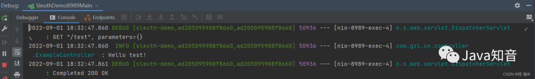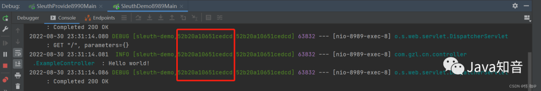 [sleuth-demo,a79df4de56426209,a79df4de56426209]此条目对应于[application name,trace id, span id]