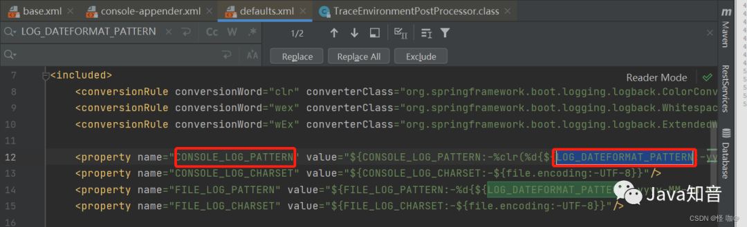CONSOLE_LOG_PATTERN就是springboot默认的日志格式:日志格式当中使用到了一个LOG_DATEFORMAT_PATTERN变量