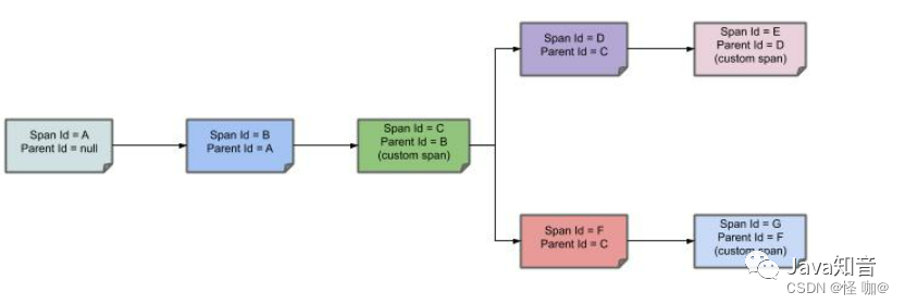 下图显示了Span和Trace在系统中的外观: 音符的每种颜色表示一个跨度(有七个跨度 - 从A到G)。