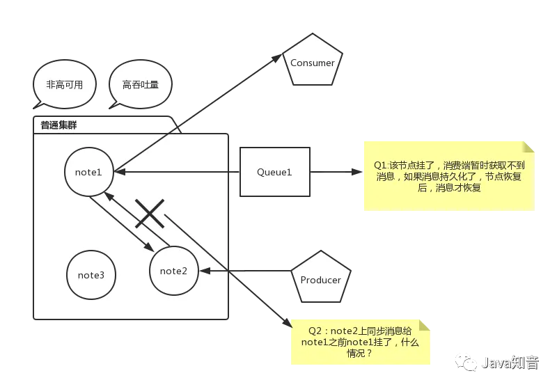 为什么设置镜像模式集群,因为队列的内容仅仅存在某一个节点上面,不会存在所有节点上面,所有节点仅仅存放消息结构和元数据。下面自己画了一张图介绍普通集群丢失消息情况: