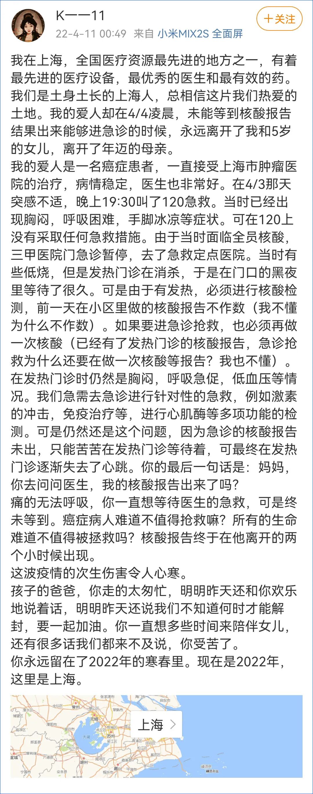 博主的爱人,一名癌症患者,一直病情稳定,4月3日,出现“胸闷,呼吸困难,手脚冰凉”,叫了120,到急救中心,前一天有在小区做过核酸,但到了医院后,还需要再做核酸检测。