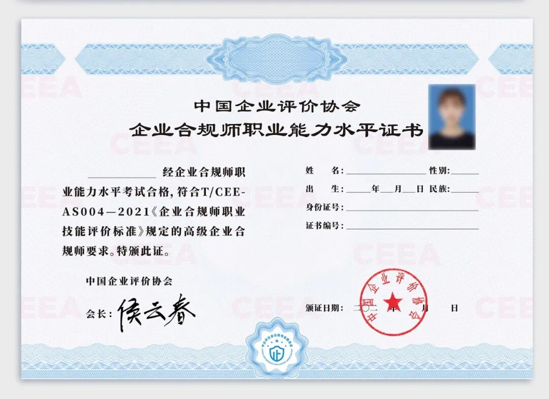 全国首个《企业合规师职业技能评价标准》由中国企业评价协会主导立项实施,考试通过颁发企业合规师职业能力水平证书。