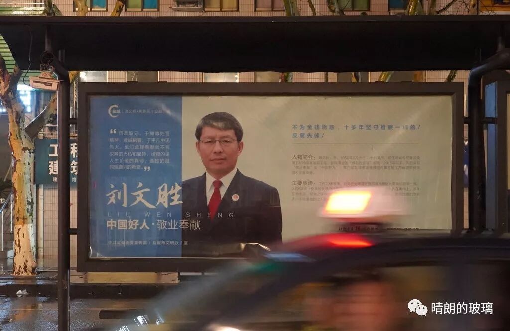 江苏盐城公交站台上,被官方广为宣传的“中国好人”刘文胜。刘虎 摄