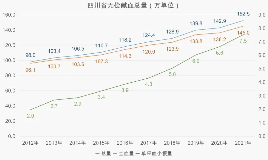 十年来,全省血液采集量稳步增长,临床用血保障能力显著增强,全省血液采集人次和采集量由2012年的58.5万人次、98.0万单位,增长到2021年的92.0万人次、152.5万单位,分别增长达57.2%和55.6%,其中,单采血小板采集量增长超3倍。