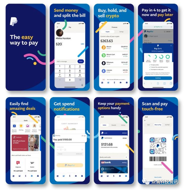 PayPal通过哪些业务赚钱?在其发展的大部分时间里,大部分收入来自接收和处理在线、移动和店内支付交易的费用,通常由商家支付。消费者收费包括从借记卡或银行账户到 PayPal 或 Venmo 账户的即时转账费用。另一个收入来源是某些信贷产品的利息。例如,PayPal 一直持有“先买后付余额”的利息收入,这些利息收入来自商家补贴消费者原本会支付的利息。收入还来自各种增值服务。在许多方面,PayPal 在 2021 年晚些时候推出的超级应用程序中越来越多地融合在一起。自 2014 年底以来担任总裁兼首席执行官的丹·舒尔曼 (Dan Schulman) 在收益报告中表示:“我们成为跨支付、基本金融服务和购物工具的重要消费金融超级应用程序的愿景比以往任何时候都更加重要,我们数以千万计的商家继续期待我们为他们提供一个全面的平台来导航数字经济,虚拟和实体商业之间的界限正在消失。”想要不断了解 PayPal 下一步发展方向的银行家和信用合作社高管可以方便地选择下载该公司的超级应用程序。这将使他们口袋里有一个 PayPal 概要。在一个地方,消费者几乎可以在支付方面做任何他们需要的事情,甚至更多:使用数字钱包支付,包括通过二维码和 PayPal 信用卡支付;将其他信用卡、借记卡和会员卡加载到钱包中;获取有关预定付款的更新;汇款和拆分账单;购买、持有和出售加密货币(即使在销售点进行购买)并以加密货币形式获得 PayPal “现金返还”奖励;点按 PayPal 的四项付款立即购买,结帐时支付以后的计划;存储贝宝现金卡余额,可以像银行账户一样提取;和更多。(PayPal 现金余额可以通过直接存款添加到 90,000 家零售商处的现金。)![]()