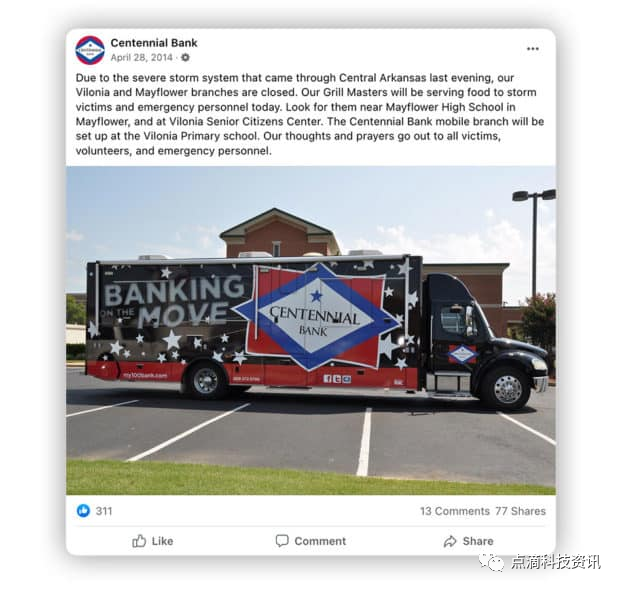 近十年来,Centennial 一直有移动银行网点机构。每当强风暴袭击阿肯色州时,该银行的一些传统银行网点可能会关闭,但其中一个流动银行网点将驻扎在附近。