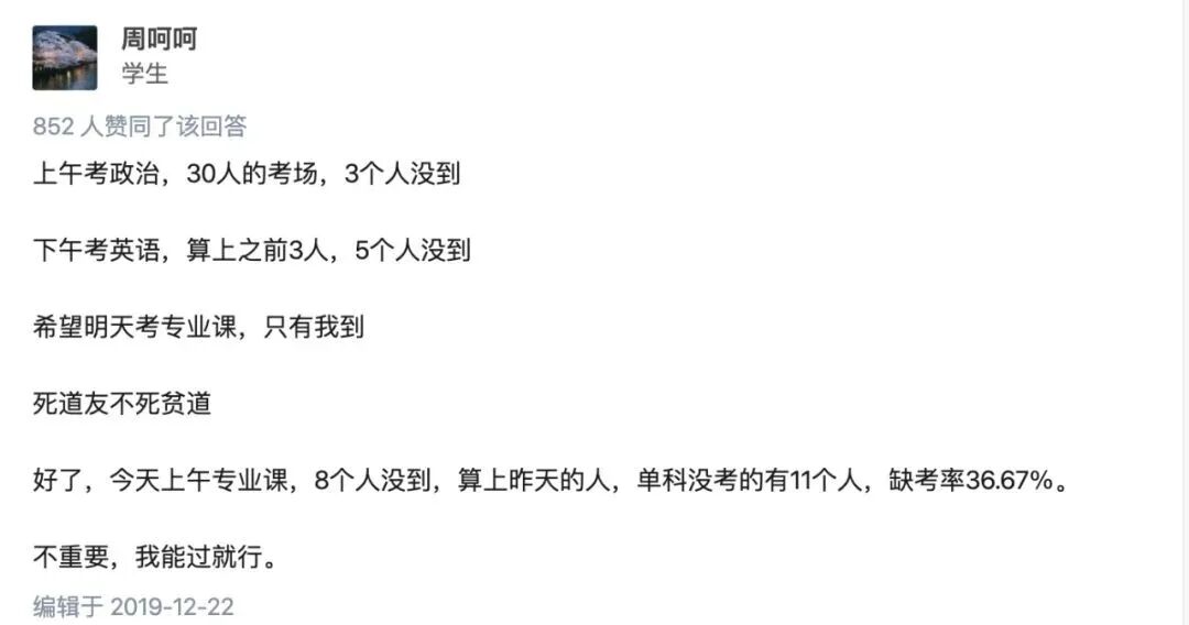 你看,考场弃考,已经成为每年考研的常识,不少同学在完成了某一门或两门的考试后,一不小心对了答案,一不小心,就放弃了……如果按照这位同学所说,那么考场上直接弃考的朋友,大概有30%?!