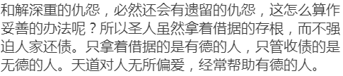和大怨,必有馀怨;报怨以德,安可以为善?是以圣人执左契,而不责于人。有德司契,无德司彻。天道无亲,常与善人。