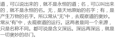 道可道,非常道。名可名,非常名。无名天地之始;有名万物之母。故常无欲以观其妙;常有欲以观其徼。此两者,同出而异名,同谓之玄。玄之又玄,众妙之门。