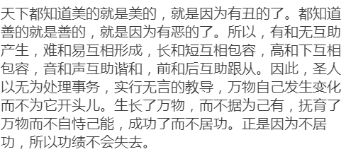 天下皆知美之为美,斯恶已。皆知善之为善,斯不善已。故有无相生,难易相成,长短相形,高下相倾,音声相和,前后相随。恒也。是以圣人处无为之事,行不言之教;万物作而弗始,生而弗有,为而弗恃,功成而不居。夫唯弗居,是以不去。