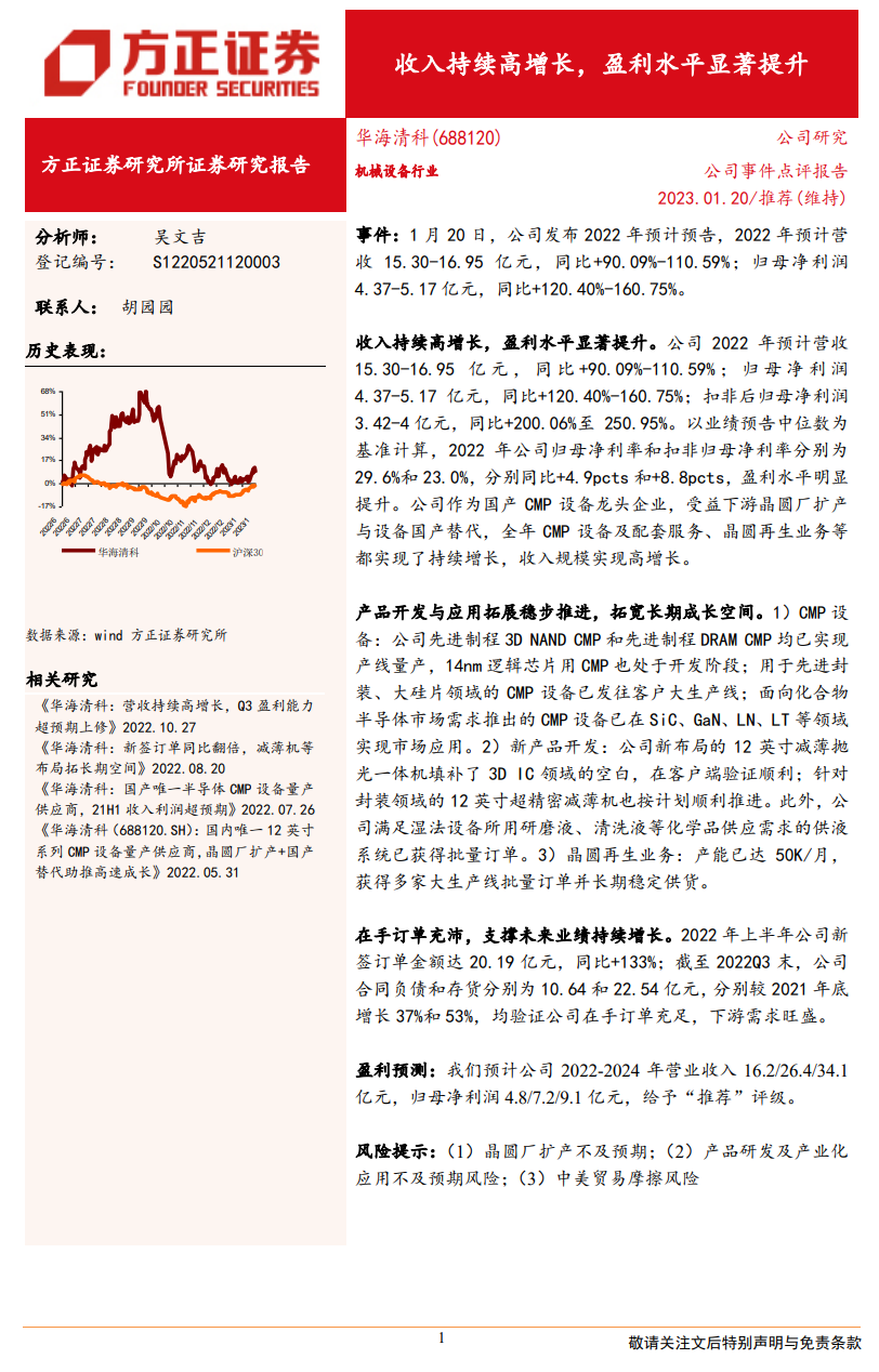 本文来自方正证券研究所2023年1月20日发布的报告《华海清科:收入持续高增长,盈利水平显著提升》,欲了解详细内容,请阅读报告原文,吴文吉S1220521120003