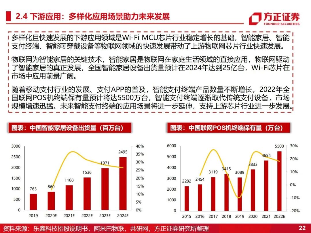 受疫情影响,短期下游产业需求疲软。随着物联网行业继续高速发展、新兴应用场景不断涌现,智能家居和消费电子智能化渗透率不断提升,工业控制和其他行业智能化实现从0到1的突破。此外,乐鑫科技作为matter的首批参与者与开拓者,也将打开更广阔的市场空间。