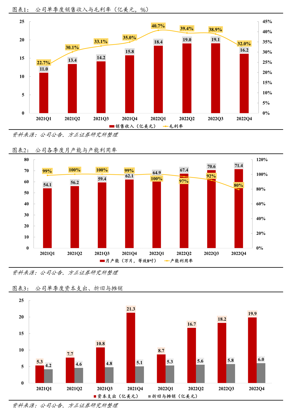 需求疲软叠加去库存,业绩环比承压。四季度看,下游手机、PC、家电等市场需求仍相对疲软,且设计公司依旧处于去库存阶段,下单意愿减弱,公司产能利用率相较22Q3的92.1%下滑至79.5%。因此,22Q4公司实现销售收入16.2亿美元,环比-15%,同比+2.6%;同样受制于需求与折旧的压力,公司22Q4毛利率32%,环比-6.9pcts,同比-3pcts。全年看,2022年公司实现销售收入72.7亿美元,同比+33.6%;实现归母净利润18.2亿美元,同比+6.8%。