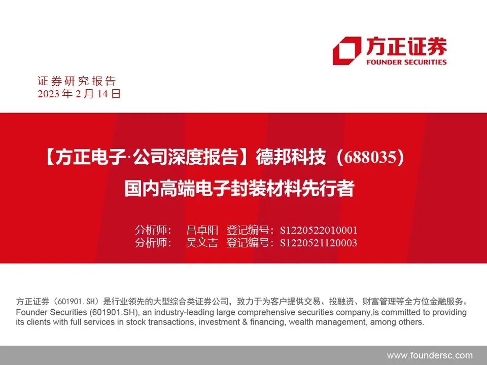 本文来自方正证券研究所2023年2月14日发布的报告《德邦科技:国内高端电子封装材料先行者》,欲了解详细内容,请阅读报告原文,吕卓阳S1220522010001