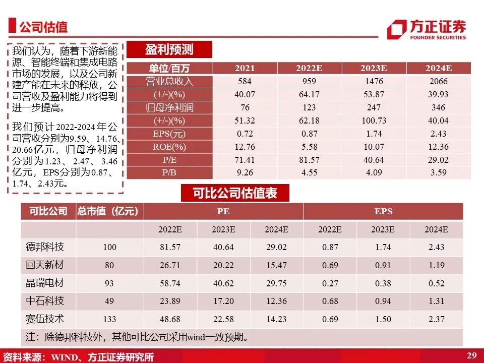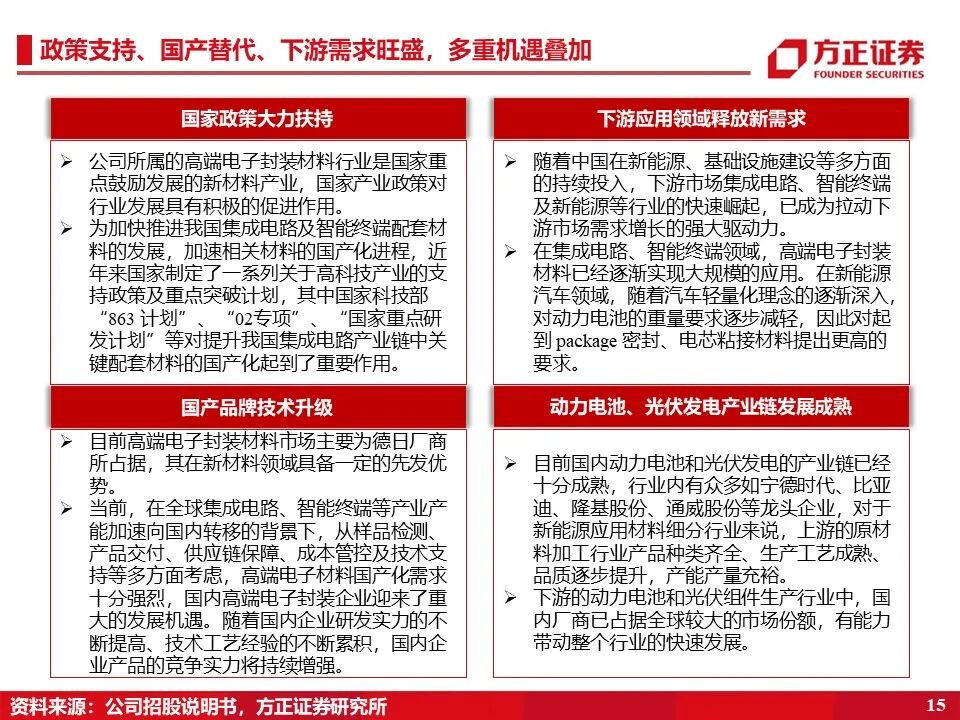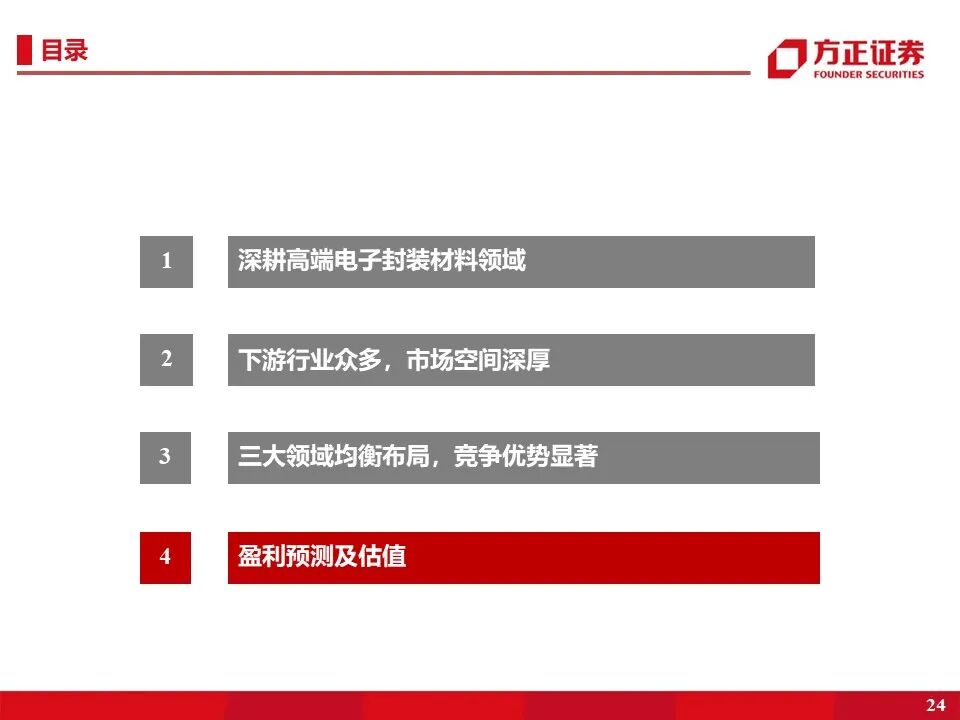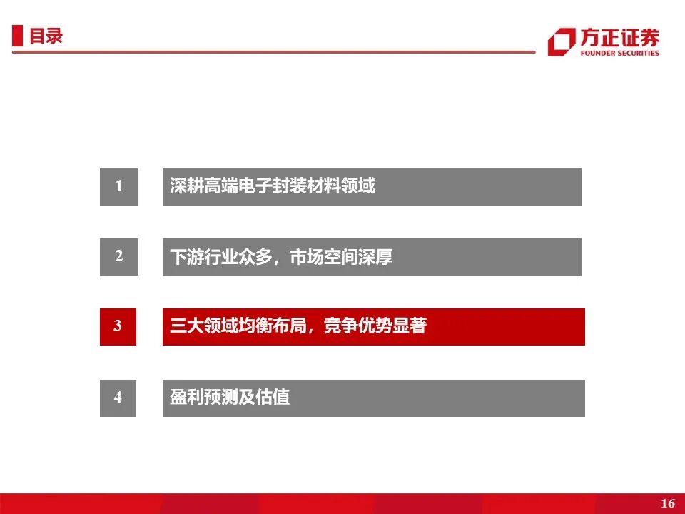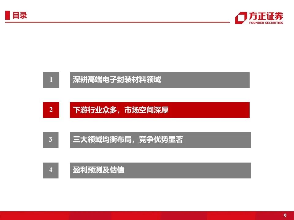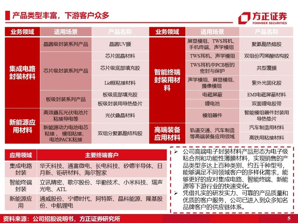 公司是国内高端电子封装材料行业的先行企业,受益国产替代浪潮加速。领域内多项核心技术实现自主可控,建立了品类齐全的产品线,并成功进入苹果、华为、小米、通威股份、矽德半导体等众多知名品牌的供应链体系。公司在高端电子封装材料细分领域已取得长足发展, 部分产品性能、规格已达到或接近国际先进的技术水平,甚至在响应速度、配套服务、定制化研发等方面具备更显著的优势,具备了较强的综合实力。在全球集成电路、智能终端等产业产能加速向国内转移的背景下,高端电子材料国产化需求十分强烈。公司是国家集成电路产业基金重点布局企业,作为行业领先者有望优先受益。