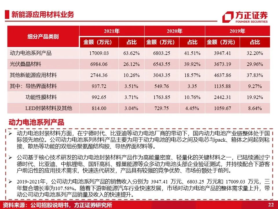 动力电池行业受益于新能源汽车需求旺盛,市场规模不断扩大,带动动力电池封装材料需求大幅增长。公司深度绑定宁德时代、比亚迪、亿纬锂能、国轩高科、中航锂电、蜂巢能源等, 为上述动力电池厂商提供pack粘接用聚氨酯复合材料等产品。公司在动力电池材料具备一定的领先优势,目前在动力电池头部客户中占比处于较高的水平,单品类产品市场占有率可达30%以上。根据市场需求情况,公司已对年产 8800吨动力电池封装材料部分进行了先行投入。