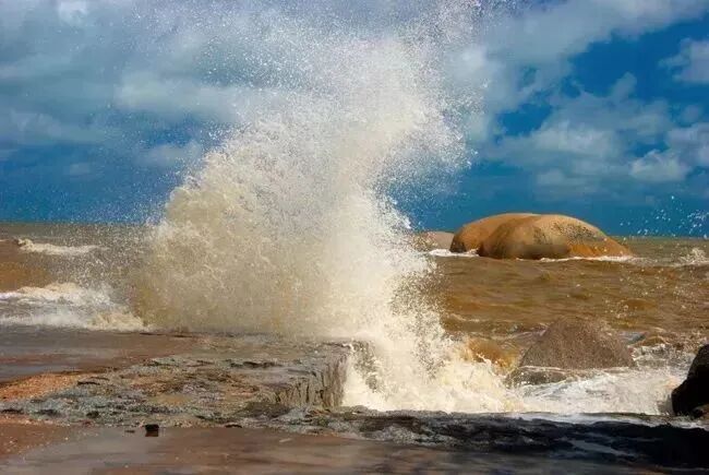 要知道潮头有多么高,连越山都完全被吞没在浪花。