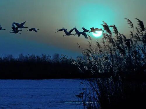 露水寒冷烟气变凉,芦苇也不开花了。天边长途飞行的雁,声音凄清高远。银河光照下的秋天夜晚,灯光暗淡的西汉皇帝的离宫上空,一声雁鸣刚刚传,想起了在潇湘时的生活。水岸遥远,无人打扰,食物和水丰盛。俯望那无边的平坦田野,犹豫不定地想降落地上,但和以前一样,被风吹草动受惊而飞走了。