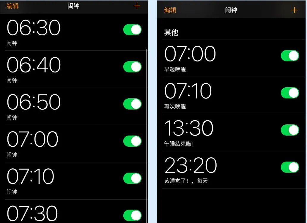 尽量不设置多个密集的闹钟,因为过度密集的闹钟会让人内心产生抵触,反感起床这件事,让身心会产生一种惯性抵触,觉得起床是一件麻烦难受的事情。另外,如果真的觉得太早起不来,不如多睡半小时,然后给自己预留十几分钟缓冲的起床时间,多半小时的睡眠,状态可能会不太一样。