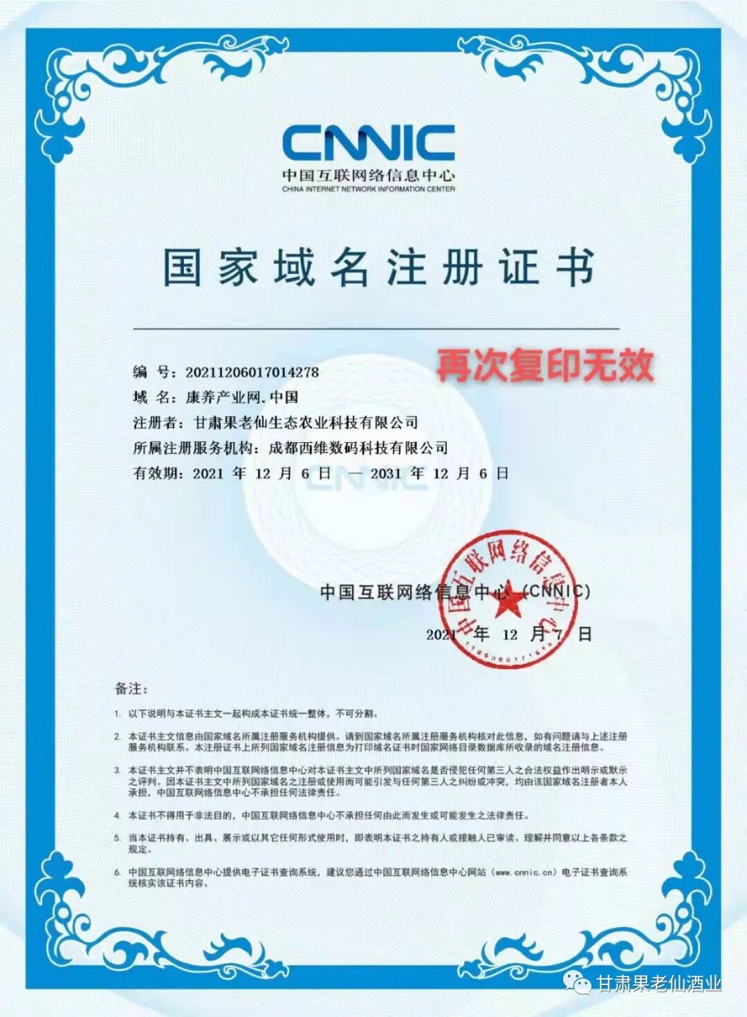 同时,果老仙生态农业在生态康养上又取得了新进展,成功注册了康养产业网.cn、康养产业网.中国、康养产业网.公司、康养产业网.网络等。进一步扩大了生态康养产业的版图,也为果老仙生态农业发展互联网产业奠定了坚实的网络基础。