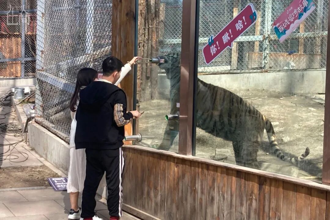 4月23日,一只野生东北虎闯入黑龙江省密山市,咬伤一人,拍碎一块玻璃。晚上9点,麻醉枪连射四针后,它在沉睡中被抬走。两天后,这只疑似从俄罗斯边境翻越而来的东北虎被命名为“完达山一号”,并被送往横道河子东北虎林园,进行为期45天的全封闭隔离。最新的消息一直没有出现,这只野生东北虎似乎消失在了人们的视野中。从牡丹江市去横道河子东北虎林园很方便。搭乘只需十八分钟的动车,出站后步行就能到达园区。进园要坐“野化训练区”的游客中巴车,车身和轮胎处,装有铁丝网,窗不是封闭的。野化区有四万平方米,在车上一览无余。导游建议游客买只鸡,“它们有食物才活跃。” 见到无人想要购买,她接着介绍道,“在猛虎区也能买肉喂食,十元钱起卖,但只有几条肉。”进入猛虎区后,隔着铁网能看到动物。一只狮子和几只老虎无精打采地呆在笼内,等着游客来喂鸡肉。在另一侧,关着一只年迈的老虎,它看起来很累,呆滞地趴在游人投喂口。游览“猛虎区”时,能听到不远处此起彼伏的虎啸声。一栋虎舍外有装修工人们在走来走去。工人们说,马上要新开放一个游览区,已经修了几个月,所以动物们只得一直关在笼子里。虎林园的一个饲养员却否认了这些说法,“它们关的时间不长,只二十多天。”4月20日,《黑龙江日报》刊发过一篇短讯:“日前,位于海林市横道河子镇的东北虎林园斥资3000万元,对园区进行升级改造。预计7月中旬完工,改造过程中园区正常营业。”这栋虎舍内约有十多只东北虎,还能见到白虎、狮子、熊等动物。透过窗看,一只老虎在狭小的空间内,来回踱步。这是一种典型的动物刻板行为——重复而无目的性,一般由焦虑引起,在生活缺少变化、活动范围狭窄的动物园较为常见。“完达山一号”在游人无法参观的繁育基地,与“观虎长廊”一条小河之隔。观虎长廊有着数百只老虎。这一大片虎群生活范围,由铁丝网和发出滋滋声的电网,隔成了大小不一的几片区域。