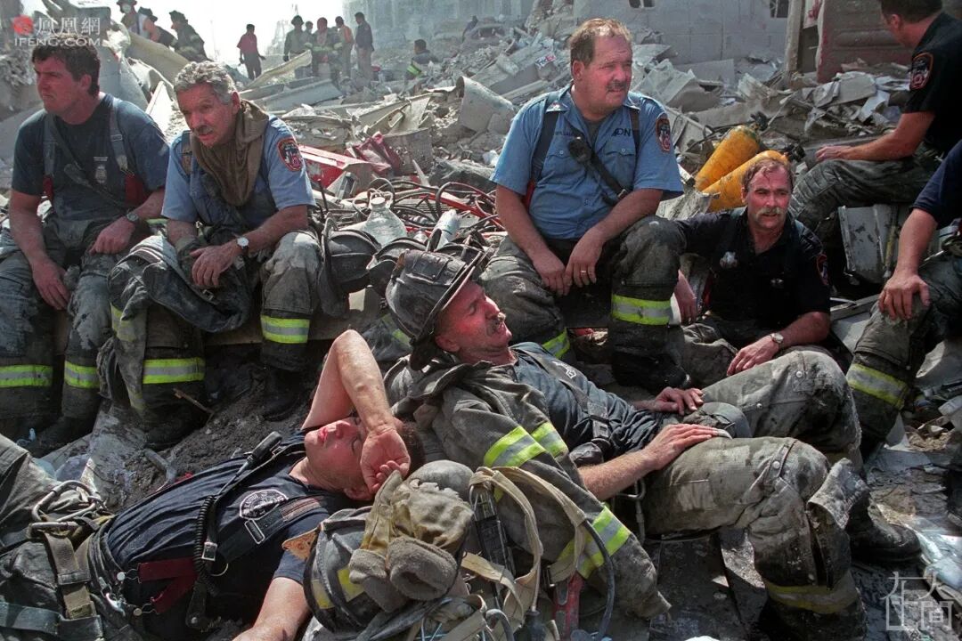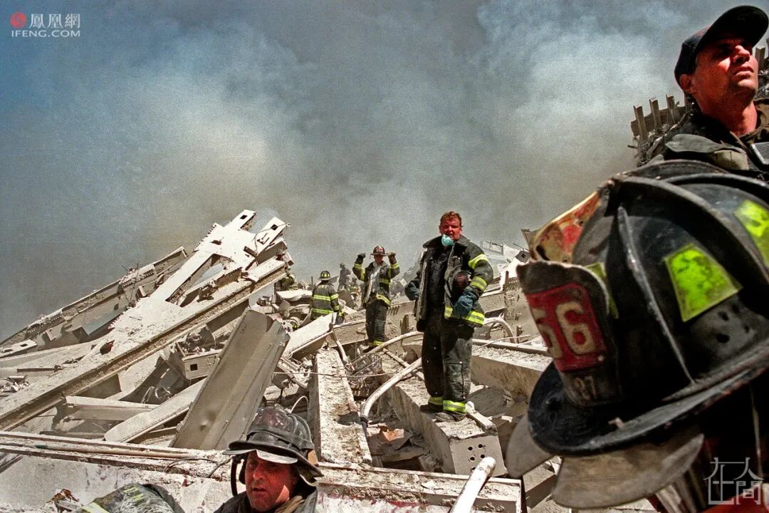 ■ 消防员站在南塔的废墟上,按照救火时传递水桶的队形,搜救着幸存者。