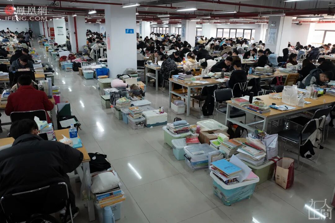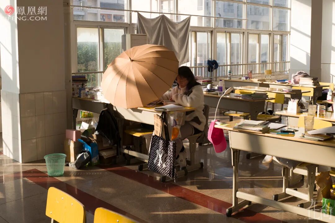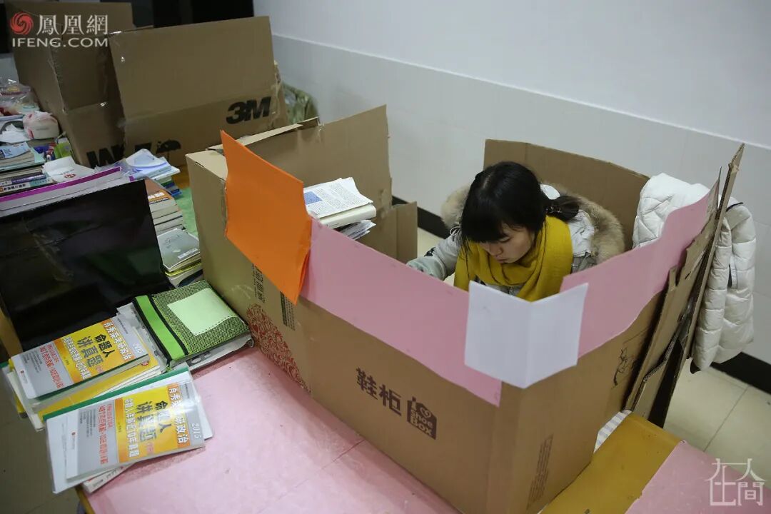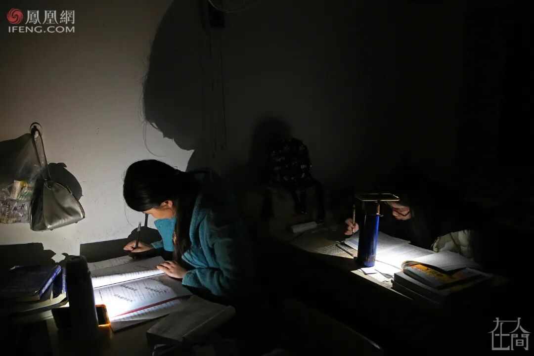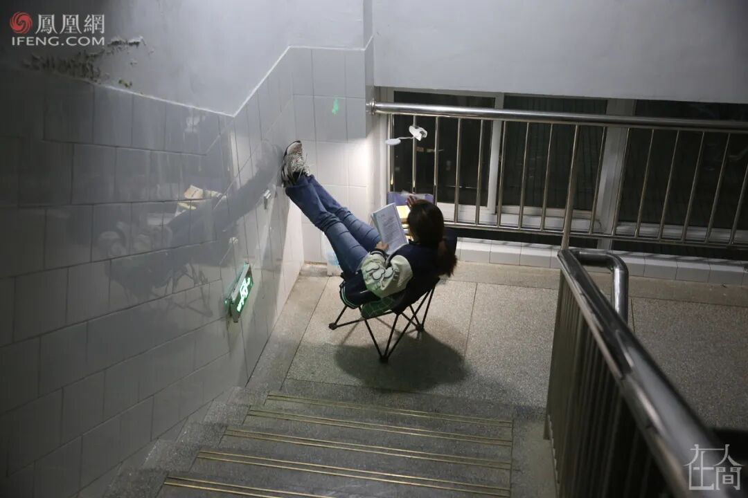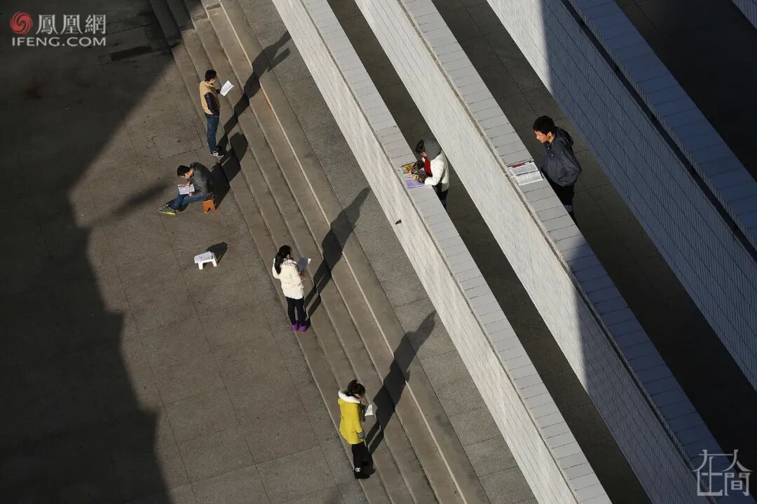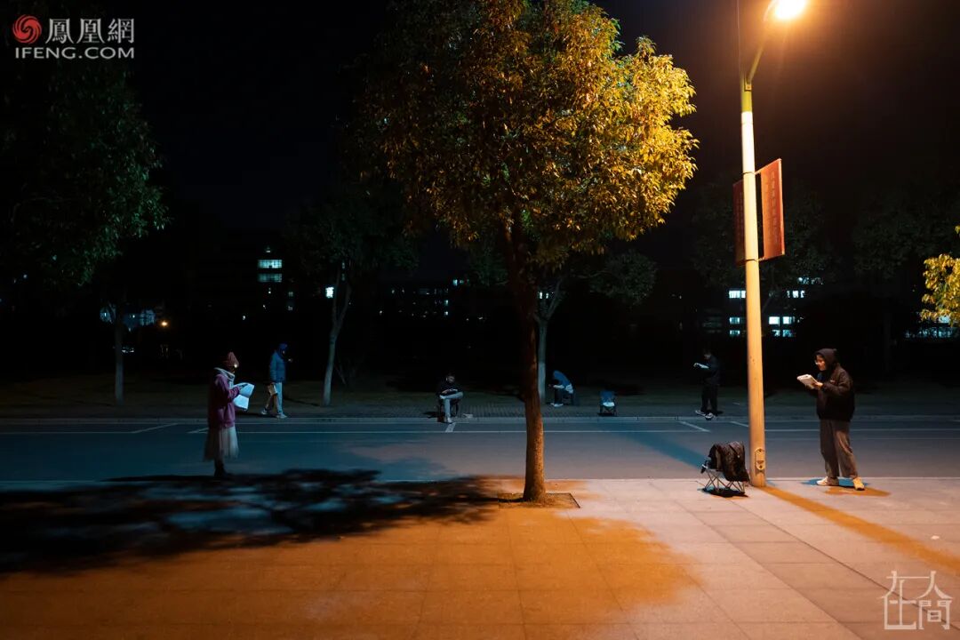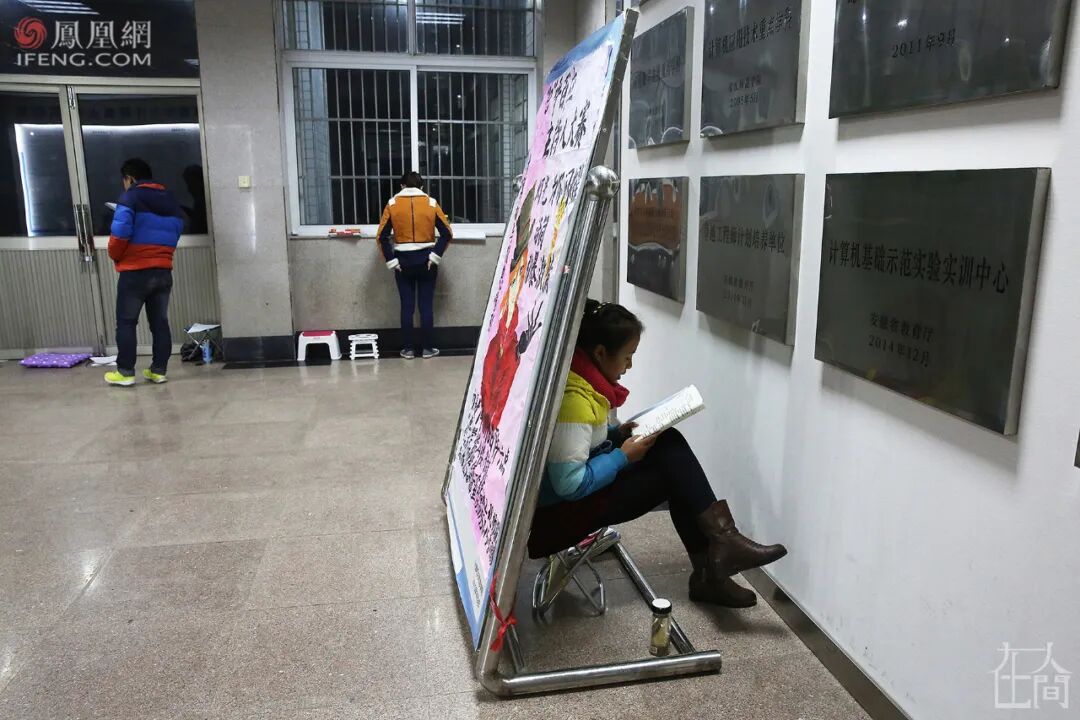 ■ 2014年11月4日清晨,安庆师范学院龙山校区,一名考研女生在图书馆的存储柜取放资料。图书馆里有数百个存储柜,上面被历年来的考研学子写满了“考研已占”等字样。教室需要占座,图书馆需要排队,有的学生或喜欢背出声,或喜欢更安静的环境,则选择了教室和图书馆外,更广阔的天地。■ 2014年10月23日,清晨,安庆师范学院龙山校区,考研自习室附近,几名学生在教学楼的过道两边背书。■ 2015年12月9日晚,安庆师范学院龙山校区,考研学子在教学楼走廊复习。■ 2015年12月16日,安庆师范学院菱湖校区,几名考研学子在教学楼的阳光里复习。考研学子大都想在大学校园的集体生活中,找到自己的私人空间,沉浸其中。实在没有,就充分利用环境和动手能力,自己造/找出一个。■ 2015年12月18日晚,安庆师范学院菱湖校区,一名考生在图书馆复习。为了有一个封闭的自我空间,她用纸盒在桌上搭建了一道“围墙”。■ 2021年12月20日,安庆师范大学龙山校区,图书馆的楼梯下,两名考研学子用隔板隔出两个复习用的“小单间”。■ 2015年11月11日,安庆师范学院龙山校区,考研学子在教学楼下大厅里背书,一名学生为防干扰坐到宣传牌后面。■ 2015年11月13日,由于连日阴雨,室外无法背书,学校许多角落被考研学生占领。在安庆师范学院龙山校区,一名女生坐在图书馆的楼梯下复习,她周边停放着许多自行车。■ 2020年11月27日,河南中医药大学,一名考研学子在教学楼的地下车库背书。■ 2021年11月6日,安庆师范大学菱湖校区,一名考研学子将椅子和考研材料放在一个暂停使用的男厕所内,厕所门上白色粉笔写着“冲水故障另寻它处”。■ 2021年11月4日,安庆师范大学龙山校区的教学楼楼顶,一名考研学子打着小台灯正在复习。■ 2015年11月13日,小雨,安庆师范学院龙山校区内,两名考研学生躲在楼道下复习。■ 2015年11月16日,安庆师范学院龙山校区,一名考研学子在银杏树下背书。■ 2015年12月9日,安庆师范学院,几名学生在图书馆楼梯上复习。■ 2015年12月7日晚,安庆师范学院菱湖校区,考研学子在教学楼楼道上复习。■ 2021年11月4日,安庆师范大学龙山校区,一名考研学子在教学楼楼道复习。■ 2017年11月16日,安庆师范大学菱湖校区教学楼的楼道上,几名考研学生打着台灯在复习。■ 2018年12月10日,安庆师范大学教学楼楼道上,一名考研女生打着哈欠背书。2017年11月,安庆气温突降到零下,在安庆师范大学菱湖校区室外,很多学生裹着毛毯、打着台灯在楼道上背书。我清楚地记得,在大降温的那次拍摄中,有一个裹着毛毯的女生是2014级文秘专业的。我给他们上过新闻采写课,她认出了我。我问她,这么冷的天,为啥不给自己休息一天,她说,“在这里复习,可以读出来,效果会好一点。如果休息,我会感到很愧疚。”2016年的11月,因为电路故障,安庆师范大学龙山校区突然停电,我赶到考研自习室,发现很多学生并未回去。他们打开手机电筒坚持复习,教室中星星点点,四墙上拉出了长长的、变形的黑影。今年11月,我出差安徽六安,顺便去了一趟皖西学院。这个学校备考集中的地方是图书馆。那个现场很震撼。图书馆闭馆后,夜渐深了,考研学子们在路灯下来回走动着背书,有人看到了凌晨……2021年11月10日,夜晚11点,皖西学院,考研学子仍在图书馆前的路灯下背书。而第二天凌晨5点,又有人陆续来到图书馆,用书本、小马扎或者干脆就是一支笔,摆放在图书馆的门前排队,然后继续去附近背书。临近8点图书馆开馆时,他们再回来按照占座物品摆放顺序,有序排队进馆。■ 2021年11月11日,皖西学院图书馆前,考研学子用书、笔和小马扎等代替自己在图书馆前排队。■ 2021年11月11日,皖西学院图书馆前,临近8点,在周围背书的考研学子回归队伍准备进馆。■ 2013年12月24日,安庆师范学院龙山校区,临近考研,学子们在排队打开水的空隙也争分夺秒地复习。2015年,我在拍摄中发现,在临近考研笔试的最后两个月,安庆师范学院广播电视学专业的学生倪明亮,每天晚上都学到凌晨2点,第二天早上5点半起床,中午午休1个小时,一天睡眠仅4个半小时。■ 2014年7月16日,安庆师范学院龙山校区,一名女生躺在考研自习室座位上准备午休。■ 2003年,安庆师范学院化学化工学院同一宿舍7名女生同时考取研究生。2003年,安庆师范学院化学化工学院一个寝室7名女生同时考取了研究生——当时这个新闻在全国都“炸”了。国内很多媒体都做了报道,当时用了这样的表述:“该校512寝室7名女生全部考上研究生,创造了全国罕见的‘七朵金花’现象。”彼时,本科生就业还是很容易的,包括安庆师范学院的毕业生去上海这样的大城市的中学就业,也是不难的。而考研意味着更好的就业,更多可能性的未来……