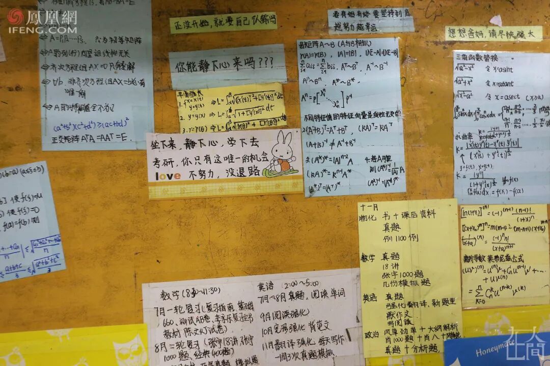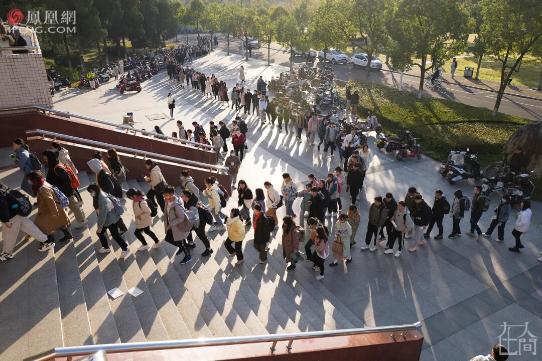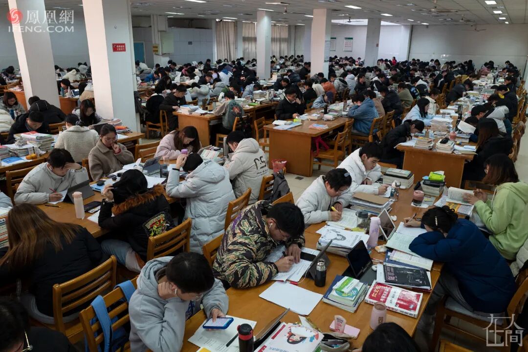 美国教育社会学家马丁·特罗将高等教育的发展划分为“精英化、大众化和普及化”三阶段:中国高等教育于2002年从精英化阶段进入大众化阶段,2019年开始从大众化阶段迈入普及化阶段。2020年全国高校毕业生874万人,比2019年增加40万人。教育部开展了“升学扩招吸纳行动”——硕士研究生扩招18.9万、专升本扩招32.2万。以安庆师范大学为例,去年在本校报考研究生人数2560人,占毕业生比55.4%;今年报考研究生人数3700人,占毕业生比64.8%。报考人数大幅提升。■ 2021年11月19日,安庆师范大学龙山校区,一名考研学子在大雾中复习。教育部公布的数据显示,全国硕士研究生招生考试报考人数从2003年的79.7万人增加到2021年的377万人。就业严峻,是国家扩大研究生招生规模的重要原因之一。但个人考研的原因可以说是混杂的,也是变化的。从我所了解的情况来看,有各种各样的原因:新冠疫情以来的就业压力,出国不安全性增加,名校情结,还有继续深造的梦想……或主动或被动的因素,使更多学子挤进了同一条名为“考研”的赛道。我认识一位“二战”考研的学生。第一次考研失利后,他去了一家教育辅导机构,每天干着产品营销与推广的工作,晋升困难。他说父母同事家的同龄人基本上都考研成功了,“父母在同事面前也没面子”。工作和家庭都让他倍感压力,于是向单位递交了辞职信,回到学校附近租房子,全力准备“二战”。还有一位2018级毕业的考生出于对科研的兴趣,今年报考了华东师范大学动物学硕士,希望通过考研投身科研事业。法学专业2018级的龙坤(化名)是想通过考研完成自己高考没能完成的梦想……2019年中国青年报联合问卷网对2002名受访者进行过一项调查中,有71.4%的人承认,自己考研或多或少都有“逃避”不理想就业的倾向。就业严峻不是无法就业,而是希望能有更好的就业,更高质量的就业。这在学生的考研原因中占比很大。还是以安庆师范大学来说,本校研究生的就业比例明显要高于本科生。而且目前很多单位的招聘门槛已经提高为研究生,这迫使大学生想得到一个更理想和满意的工作,就要选择考研。从大趋势看,高学历者的长期收入还是增长更快,同一份工作尤其高精尖岗位对文凭的要求越来越高。■ 2021年12月20日,安庆师范大学龙山校区,一名考研女生在图书馆的楼道上背书,清晨温暖的阳光将她的身影投射在外墙上。想要特别提醒的是,如专家强调的:对个人而言,研究生教育带来的不仅是薪资待遇、社会地位等显性回报,也会带来视野提升、精神愉悦和自我实现等隐性回报。■ 2014年11月8日,安庆师范学院龙山校区,2015年考研学子正在进行现场拍照确认。最近几年,我出差所到之处,只要时间允许,都会抽空到当地高校转转,拍点考研画面。从我所见来说,所有学校对学生考研都是非常支持的。因为学生努力地提升自己,以获得将来更好的发展、更高的能力服务社会,本身也是高校人才培养的目的。我去过的几个高校都建有集中考研复习的自习室。最让我感到震撼的是滁州学院的考研自习室,会峰校区图书馆的一楼有880个座位,机械楼的一楼有1200个座位,满满的全都是考研学生,可谓“巨型自习室”!■ 2021年12月4日,滁州学院会峰校区,这里可以容纳1200人同时学习。就业摆在“六保六稳”的首位,就业压力不仅仅是学生的压力,也是各高校乃至各二级学院的压力。教育部会关注大学生的就业情况,各省教育厅则会对本省各高校的就业进展情况定期通报。学生考取研究生也是就业的一种形式,如此,大学生多一些考取研究生,则另一面的就业压力就会有所减轻。各高校为学生提供了各种各样的考研服务。打开各高校的网站,考研经验交流会、考前慰问、考研动员会、考研指导讲座、复试指导讲座……每年初试成绩和国家线出来后,学院领导和老师们都会积极地帮学生联系学校,希望自己的学生能在复试中取得好成绩。当然,不遗余力帮助学生不仅仅是因为工作原因,老师关心学生更多是出自一种本能,一种非功利的自觉行为。安庆师范大学为学生开展了免费考研辅导班。辅导班课程安排在周末及寒暑假,涵盖考研英语、数学和政治课,采用现场授课的教学形式,分为基础班、强化班、冲刺班,每门公共课又分为两个大班授课。学生免费听课,免费领取教材。■ 2020年12月26日,考研日,安庆师范大学龙山校区考点,考生在排队准备进场。■ 2020年12月26日,考研日,安庆师范大学龙山校区考点,出于疫情防控需要,保安人员正在为考生测量体温。■ 2020年12月26日,考研日,安庆师范大学龙山校区考点,监考老师正在使用探测仪防止考生夹带无线通讯工具。■ 2014年12月27日,考研首日晚,安庆师范学院菱湖校区,考生仍在自习室准备第二天的考试。门上贴着考生们对来年考研学子的“温馨提示”。■ 2015年11月9日,安庆师范学院龙山校区,一名考研学子身边的墙壁上贴着许多便利贴,上面写满知识点和自我激励的话。在拍摄考研的过程中,我特别注意到桌面上写满励志话语的便利贴。那里面有支撑考生日复一日枯燥学习的信念:“迎着晨光,想一想今天该怎样努力;踏着夕阳,问一问今天有多少长进。”“纠结烦躁之后就好好看书,珍惜接下来的日子不去想结果。和时间赛跑!!!”“你要忍,忍到春暖花开;你要走,走到灯火通明;你要看过世界辽阔,再评判是好是坏;你要铆足劲