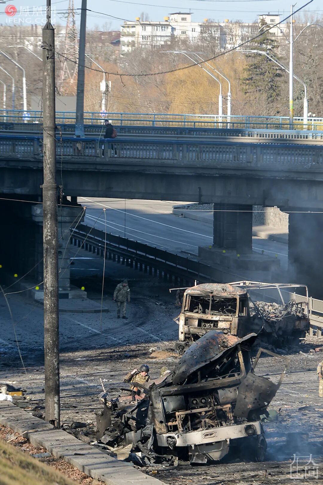 图源 | 图库 编辑 | 周娜 出品|凤凰网在人间工作室 炮火正在摧毁乌克兰人的生活,坦克在街道上横冲直撞,飞机残骸在门前燃烧,火箭弹坠入房间,平民躲进防空洞,躲进地铁站,还有很多人成为难民,离开家乡……今天是俄乌战争的第5天,基辅和哈尔科夫再次听到爆炸声,卫星图显示大规模俄罗斯地面部队正在向基辅方向移动。乌克兰内政部27日表示,目前有352名平民遇难,1684人受伤,25日则称有137名士兵阵亡。乌克兰人正在失去亲人,失去家园。也是27日,俄罗斯国防部发布公告说,俄军有伤亡,但“俄军损失比被消灭的乌克兰民族主义者少很多。”以下是过去4天,摄影师在乌克兰记录的一些瞬间。希望历史会记住这些画面。 ■当地时间2022年2月24日,乌克兰东部城镇楚吉夫(Chuguiv),一座公寓大楼遭到炮火攻击,消防员正在救火。(Photo byAris Messinis / AFP人民视觉)■当地时间2022年月24日,乌克兰东部城镇楚吉夫(Chuguiv)遭到炮击,一名受伤的妇女站在一家医院外。(Photo by Aris Messinis / AFP 人民视觉)■当地时间2022 年 2 月 24 日,乌克兰东部城镇 Chuguiv 发生爆炸,一名男子坐在被毁坏的建筑物外。当日,乌克兰首都基辅上空传来数次爆炸声。根据乌克兰官方发布的消息,当日共有7人因炮火攻击死亡,另有9人受伤。(Photo by Aris Messinis / AFP 人民视觉) ■2022年2月25日,乌克兰港口城市马里乌波尔遭到火箭弹袭击,从被击中的一个公寓楼向外望去是一辆被毁的汽车。当天,俄罗斯军队正在向乌克兰首都基辅发起进攻,枪声和爆炸声越来越接近政府区。(Photo by Evgeniy Maloletka/人民视觉) ■当地时间2022年2月24日,在乌克兰哈尔科夫北郊的一个公寓内,一支火箭卡在两层楼房的天花板之间。乌克兰卫生部公布的信息表示,在24日的冲突中已有57名乌克兰人死亡,169人受伤。(Photo by Sergey BOBOK / AFP人民视觉)■当地时间2022年2月26日,乌克兰基辅,夜战后,乌克兰军人查看被烧焦的车辆。(Photo by ANDRII NESTERENKO/EPA 澎湃影像)■当地时间2022年2月26日,乌克兰基辅,附近一栋公寓刚遭炮击,防空警报拉响,民众趴地上躲避。(Photo by Gleb Garanich / REUTERS澎湃影像)■当地时间2022年2月25日,乌克兰基辅,一架飞机撞上居民区房屋坠毁后的残骸。(Photo by Umit Bektas/REUTERS澎湃影像) ■当地时间2022年2月26日,顿涅茨克州戈尔洛夫卡市一处受损的公寓楼,一名男子站在被炮火击碎的窗户前。(Photo by Sergei Bobylev/TASS人民视觉) ■当地时间2022年2月24日,乌克兰马里乌波尔,一名男子抱着一只狗走过被俄罗斯炮击后受损的房屋。俄罗斯当天对乌克兰发动了广泛的袭击,以空袭或炮击袭击了城市和军事基地,当地民众纷纷撤离。(Photo by Evgeniy Maloletka/人民视觉) ■当地时间2022年2月24日,乌克兰基辅,在俄罗斯的袭击后,乌克兰警察正在检查该区域。(Photo by Emilio Morenatti/人民视觉) ■当地时间2022年2月24日,在乌克兰马里乌波尔郊外,乌克兰军事设施遭俄军炮击,雷达阵列和其他设备受损。(Photo by Sergei Grits/人民视觉) ■当地时间2022年2月25日,乌克兰基辅,总统泽连斯基就俄罗斯的军事行动发表讲话。泽连斯基表示,乌克兰被孤立了,世界正从远处观看正在发生的事情。(Photo by Anadolu Agency / Getty Images人民视觉) ■当地时间2022年2月26日,乌克兰基辅,来自领土防卫部队的志愿者在防空洞地下室用玻璃瓶自制燃烧弹。(Photo by Chris McGrath/Getty Images人民视觉)■当地时间2022年2月26日,乌克兰基辅,来自领土防卫部队的志愿者聚集在一个前哨站、收集武器、接受训练并接受任务。(Photo by MARCUS YAM / LOS ANGELES TIMES POLARIS 人民视觉) ■当地时间2022年2月26日,在卢甘斯克地区的袭击之前,乌克兰坦克在公路上行驶。卢甘斯克武装力量表示,过去9天,乌克兰军队对卢甘斯克地区发动595次袭击,其中超过80%使用重型武器。(Photo by Anatolii Stepanov / AFP人民视觉) ■当地时间2022年2月26日,卢甘斯克地区发生袭击事件前,一名乌克兰军人在巡逻。(Photo by Anatolii Stepanov / AFP人民视觉) ■当地时间2022年2月26日,乌克兰哈尔科夫郊外,一名乌克兰士兵在装甲车前抽烟。当天,乌克兰总统泽连斯基称乌克兰军队击退了本轮袭击,并发誓要继续战斗,“我们会迎来胜利”。(Photo by Andrew Marienko/人民视觉) ■当地时间2022年2月26日,在卢甘斯克地区的郊外路边,一辆被乌克兰军队摧毁的俄罗斯坦克正冒出浓烟。(Photo by Anatolii Stepanov / AFP人民视觉) ■当地时间2022 年 2 月 27 日,在乌克兰基辅附近的瓦西尔基夫被俄罗斯导弹袭击后,一个石油储存库发生大火。(Photo by ALISA YAKUBOVYCH / EPA 澎湃影像) ■当地时间2022年2月24日,在乌克兰首都基辅的防空洞地下室,6岁的斯维亚托斯拉夫正在玩儿电子设备。(Photo by Emilio Morenatti /人民视觉)■当地时间2022年2月24日,乌克兰首都基辅,民众躲避在地铁站内休息。24日晚,乌克兰首都基辅市开始执行宵禁,宵禁时间为22时至次日早7时。宵禁期间所有人员可以离开但不得进入基辅。26日,乌克兰通讯社援引基辅市市长克利奇科的话报道,由于基辅街头出现俄罗斯军队派出的侦查和破坏小组人员,基辅市决定延长宵禁时间,宵禁时间从每天下午5时至次日8时。(Photo by Emilio Morenatti /人民视觉) ■当地时间2022年2月24日,乌克兰基辅,民众试图通过巴士离开首都。(Photo by Emilio Morenatti/人民视觉) ■当地时间2022年2月24日,24日清晨,基辅地铁站外,有人拖着着行李经过,有人相拥。根据乌克兰官方发