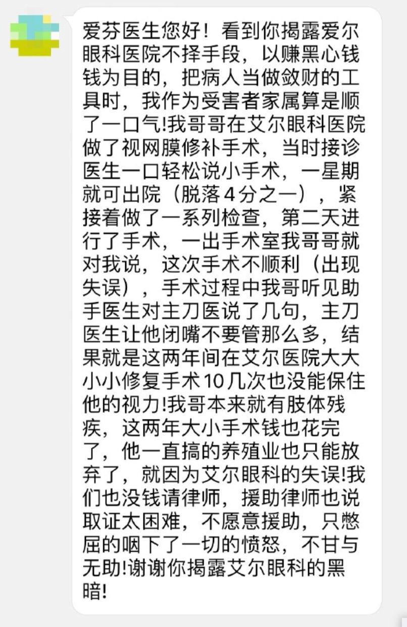 自从在微博中开始揭露爱尔眼科医院在我的近视治疗过程中错误违规的诊疗行径开始,陆陆续续有很多网友给我发来自己或者家人在爱尔遭受类似痛苦经历的帖子。我在其中看到了无尽的愤怒、无助和悔恨,更有无数的网友鼓励支持我发声和维权。我是一个简单的人,简单到认死理:有错误就必须承认错误,不承认错误就不可能真正改正错误;对我一个人承认错误没有用,必须对所有公众公开承认错误;如果我这样的医生患者爱尔都要欺骗,那么普通的老百姓患者更加维权无门!
