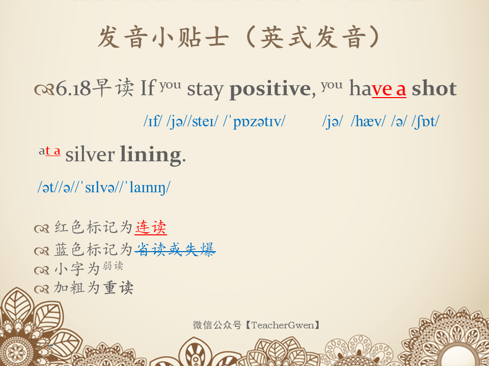 3. 词链儿:silver lining (困境中的) 一线希望; 事情好的一面是...