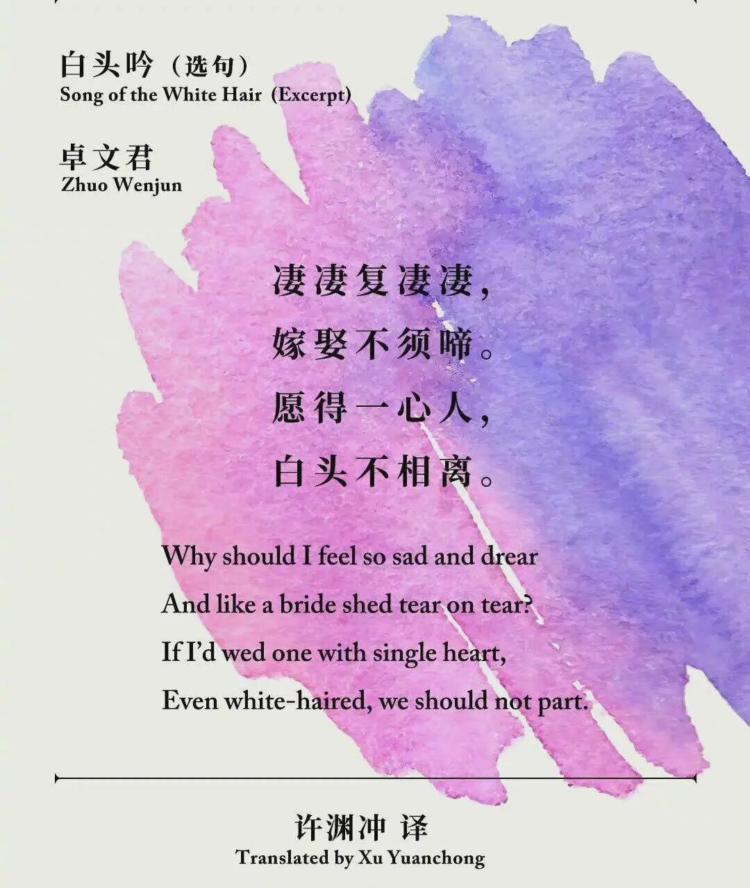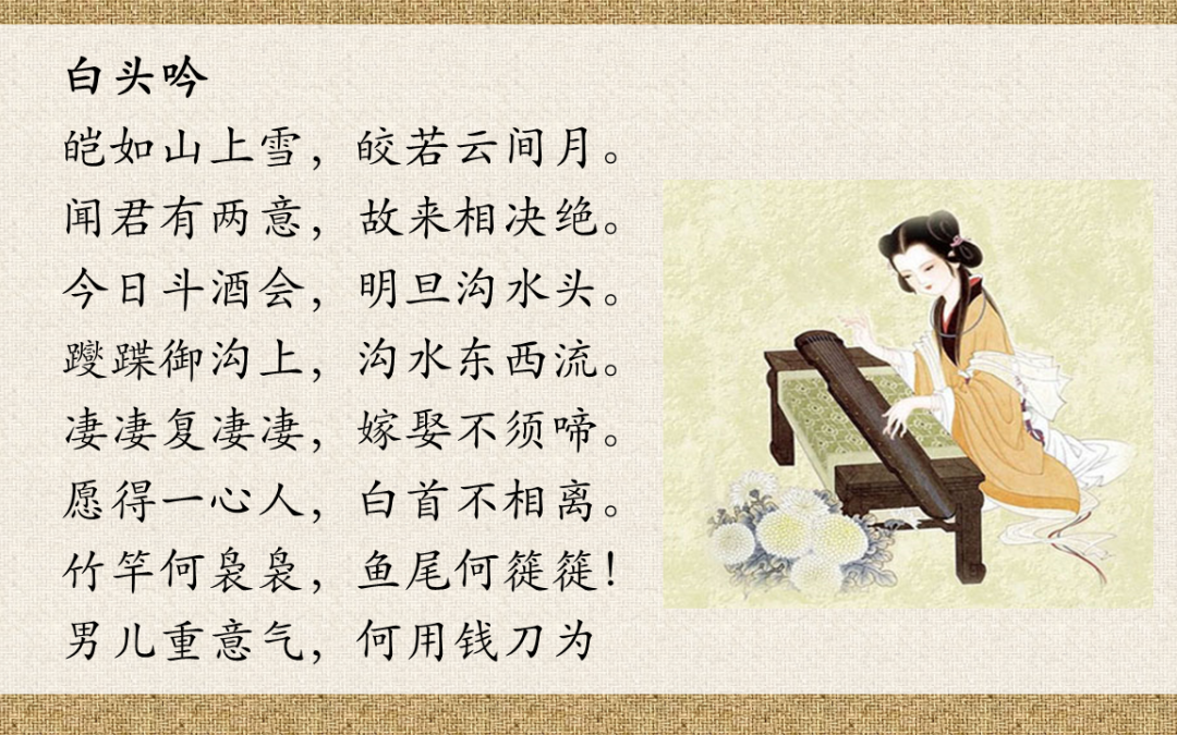 《白头吟》(汉乐府民歌):相传为汉代才女卓文君所作。此诗描写女主人公对负心男子表示决绝,塑造了一个感情强烈、个性爽朗的女性形象,表达了主人公失去爱情的悲愤和对真正纯真爱情的渴望,肯定真挚专一的爱情态度,贬责喜新厌旧、半途相弃的行为。全诗集中笔力描写女子的言行、思想、心理活动,突出其形象,同时,灵活多样的比喻,增加了诗的形象性和艺术感染力。