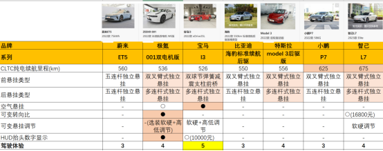 点评:驾驶体验主要考虑的是纯电续航和悬挂类型。宝马i3是三十万级别中唯一标配空气悬挂的轿车,且采用了双球+多连杆悬挂,驾驶舒适度高。智己L7、特斯拉model3、极氪001均采用的多连杆悬挂,舒适度比五连杆高;蔚来ET5的底盘配置不高,五连杆的舒适度不及多连杆,且不能选配空气悬挂和HUD抬头显示,这方面稍逊于竞品。 图:智能驾驶对比