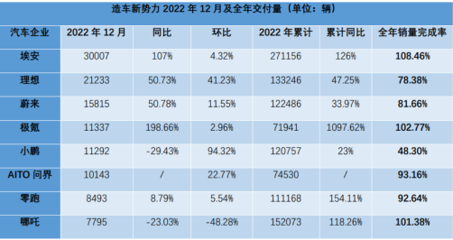 注1:股东招募启示,仅限长期跟踪并认可、能真正看懂我们的机构及个人。有意面谈,微信tower9185注2:入群,加入产业链讨论社群,请加微信:bgys20152022年交付量出炉,新势力表现不一,有的车企超额完成全年目标,有的完成率不及50%。蔚来官方数据显示,其2022年12月交付新车1.58万辆,环比增长11.6%,同比增长50.8%;2022年累计交付量约12.2万辆,同比增长34%,达到了全年目标的81%。根据目前已公布的数据来看,2022年全年目标完成率较好的是比亚迪(124%)、埃安(108%)、极氪(102%)、哪吒,完成率较差的是小鹏(48%)。此外,走高端路线的理想(78%)、蔚来(81%)则离目标差距不远。对于理想和问界所在的增程式汽车产业链,我们前端时间做过跟踪(详见产业链报告库,扫描文末二维码可订阅)。