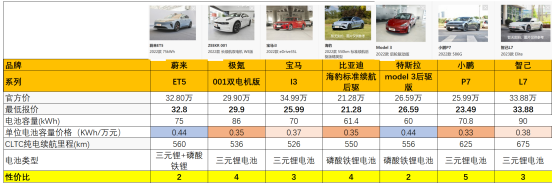 考虑到电池是整辆车成本居首的硬件,我们采用单位电池价格指标(即:车底价/电池容量),该指标越高,说明消费者每购买1度电成本。对比下来,ET5(0.44)续航里程仅有560公里,性价比要明显低于竞品,同样的续航里程,宝马i3车价仅要26万、比亚迪海豹仅要21万,小鹏P7续航里程达到625公里,售价也仅有23.5万。图:性价比对比