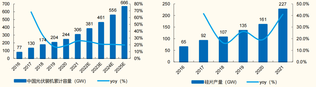 2021 年中国光伏发电累计并网容量为 306GW,同比增长 25.7%;根据中电联预测,2022-2025 年中国光伏发电的累计装机容量年化复合增速有望达到 20.46%;受益下游需求驱动,上游关键组件硅片近年来产量规模也呈现迅速增长态势,2016-2021 年CAGR 达到 28.4%。