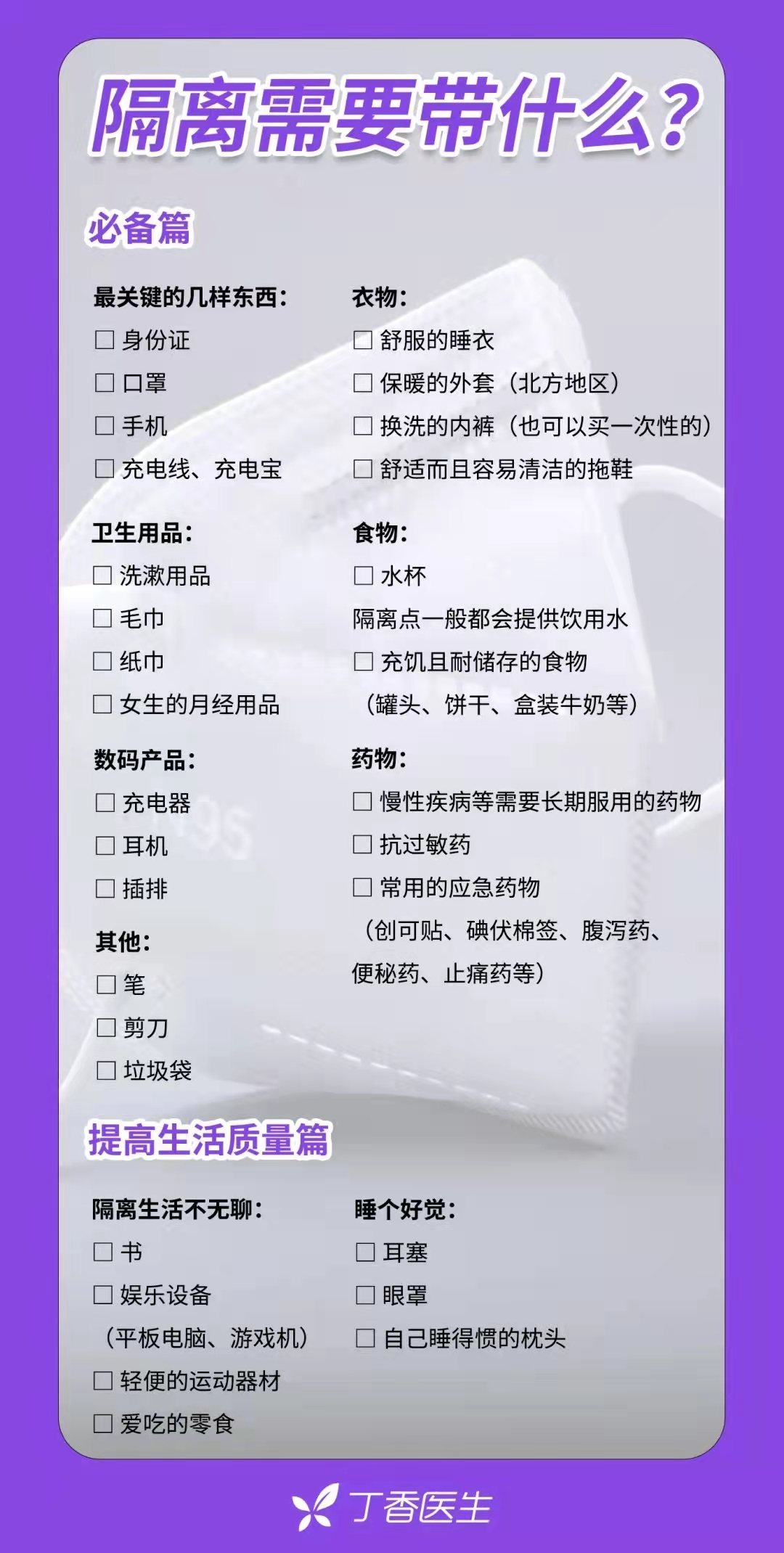 事情落到自己头上的一瞬,心里还是会咯噔一下,马上想到要是全家隔离了,小孩怎么办?但很快恢复冷静,先报告居委会联系第二天的核酸复检,再做一些必要准备。我找来一张隔离必备用品图,跑去给大宝推荐,结果发现他已经把学习用品全打包了,那感觉就像随时准备出门旅行一样,为爹甚为欣慰。大宝问隔离酒店有没有网络,我说可能住方舱,有没有网络不知道,先别想着上网课了,可能会失去更多。