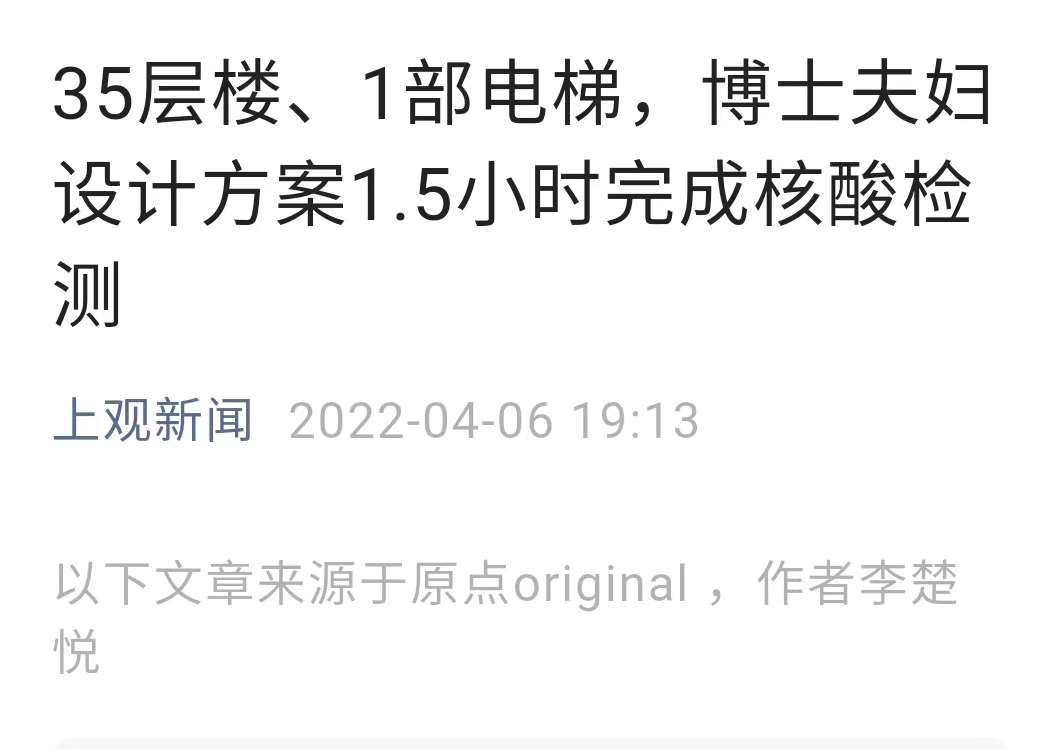 记者李楚悦是我以前的小同事,现在写这种非常时期的非虚构作品,太好了。报道中强调,两部电梯坏了一部,只剩一部电梯,很有难度。但我在想,如果有两部电梯,事情反而变得复杂,有兴趣的可以去计算验证一下。